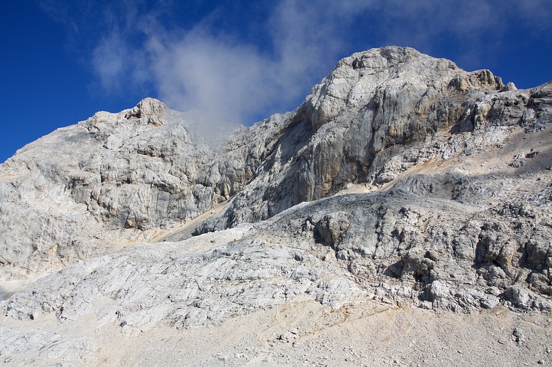 Od Domu Planika nás čeká závěrečná zteč Triglavu (vlevo) přes Malý Triglav (vpravo)