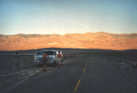 oknech a s litrem vody po ruce. Ráno v Death ValleyKolem šesté hodiny náhodou procitnu a vidím, že se již pomalu rozednívá. Postupně ostatní probouzím, musíme se vydat na cestu, neboť na Dante´s View je to ještě pár mil. Jsme uprostřed pouště, všude je jen písek, skály a kamení, naprostá pustina. Jen na druhé straně silnice je kadibudka a v ní pochopitelně stejně jako kdekoliv jinde v Americe několik ruliček toaletního papíru. Komfort. Vyrážíme na cestu a po pár minutách začíná slunce olizovat protější vrcholky hor. Dante´s view stále nepřichází a nepřichází a tak zastavujeme jen tak na krajnici. Slunce již vyšlo více a tak osvětluje asi polovinu horského hřebene. Je tu bizarní krajina. Děláme spousty fotek. Pak zamíříme dále pustou krajinou ven z Death Valley a pofrčíme Nevadou do Las Vegas. Ve stoupání do sedla s nadmořskou výškou 1100 metrů jsme ještě jednou museli zastavit kvůli přehřívajícímu se motoru.